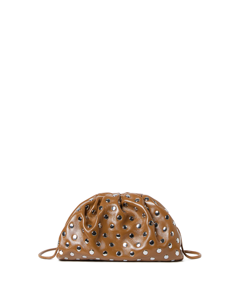 Dome-shaped frame pouch in espresso brown Italian suede with silver-stud embellishment. Features a tonal leather strap, frame closure, full lining, and interior card slot.