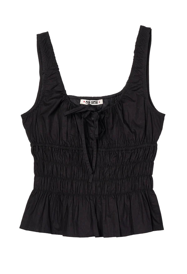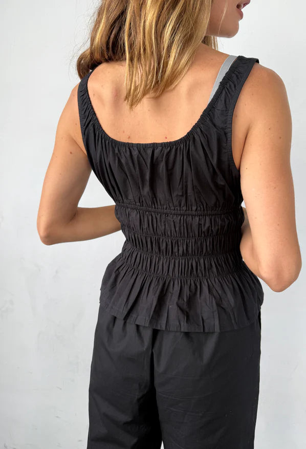 The Gigi Top is a black cotton top modeled after our Gianluca Dress. The top features a keyhole bust and rows of stretchy smocking underneath the bust.