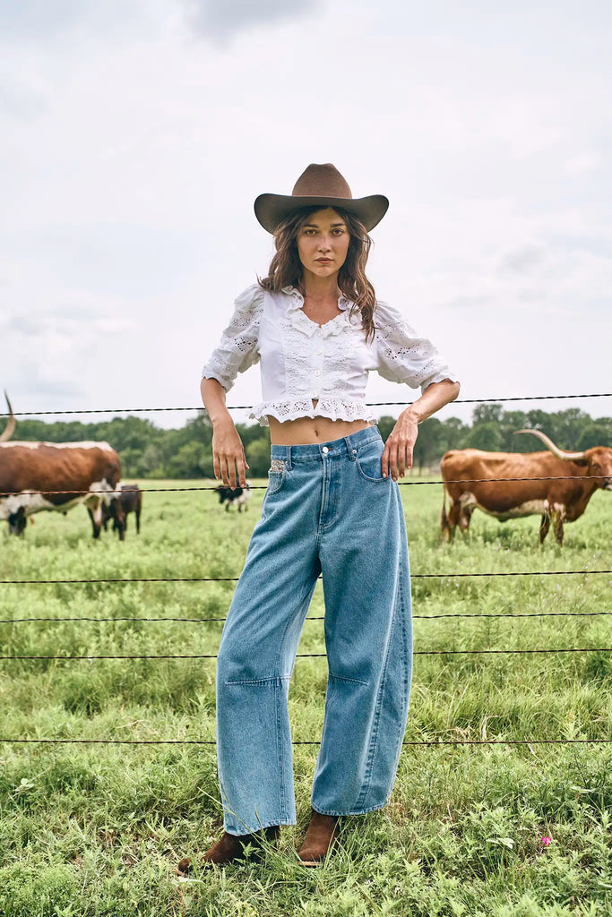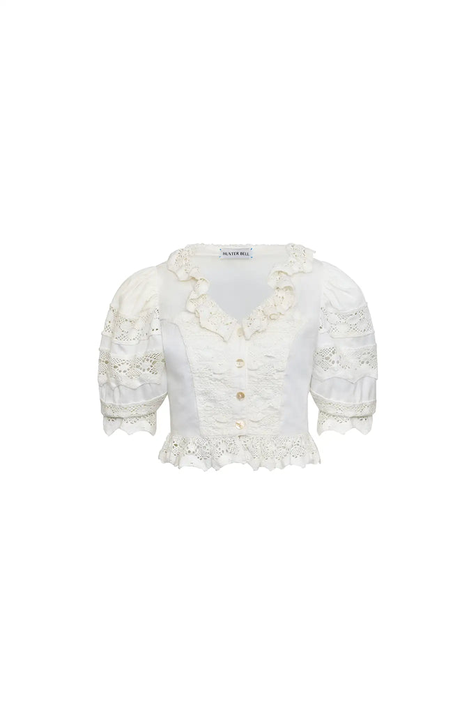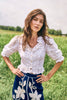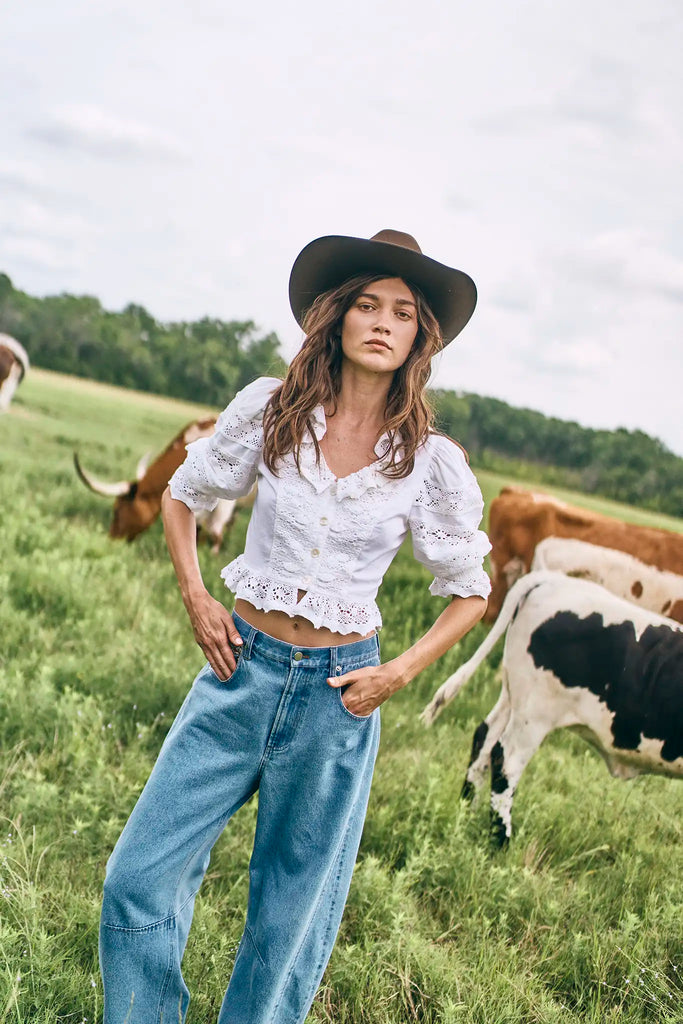The Primrose Blouse is a romantic reimagining of the classic white blouse. A flattering V-neckline framed by a soft ruffled collar sets a feminine tone, while the cropped silhouette, button front, and elbow-length sleeves with delicate ruffle detail add to its charm. Crafted from crisp cotton broadcloth, it’s the kind of piece that feels fresh yet timeless.