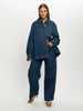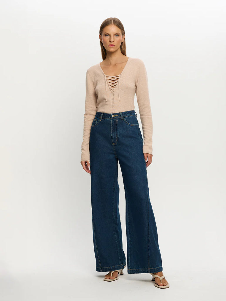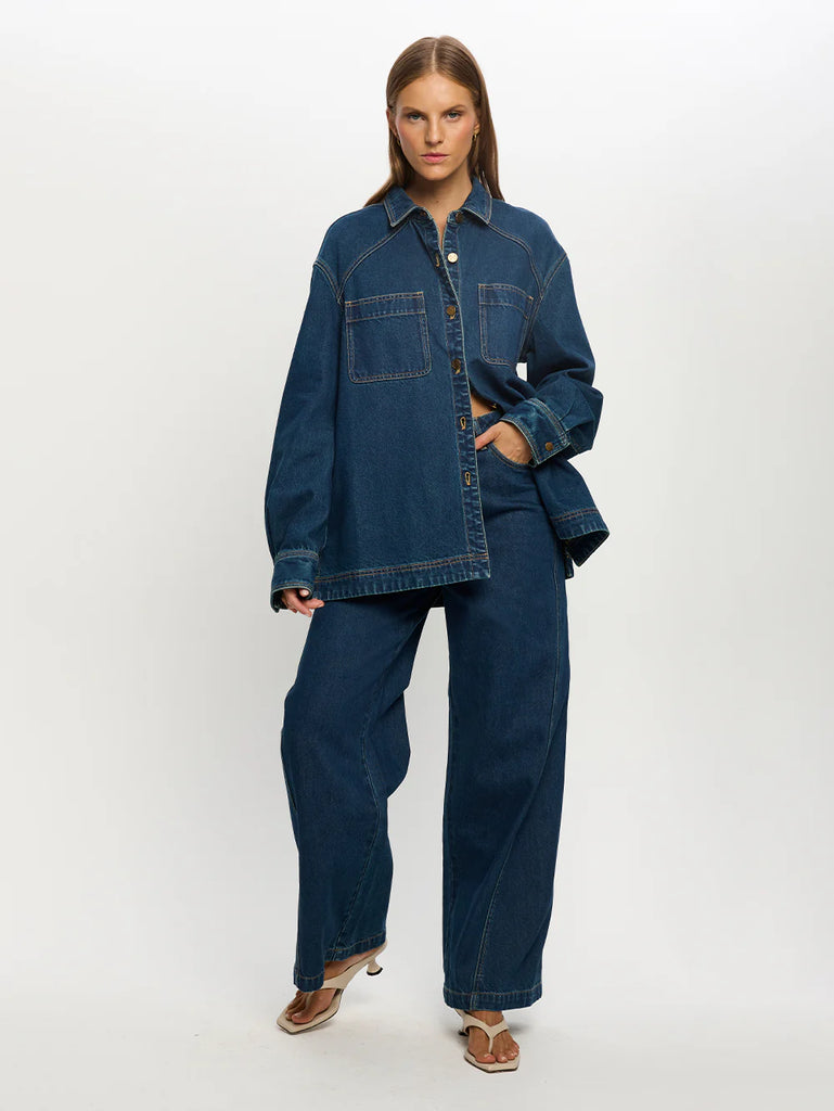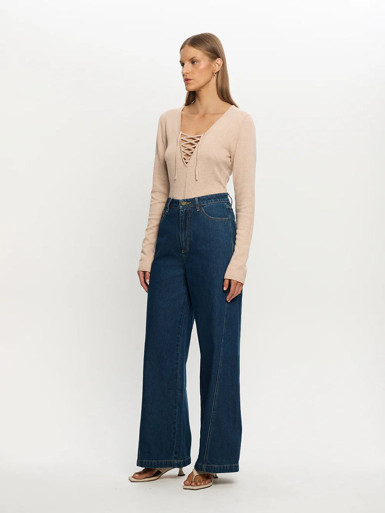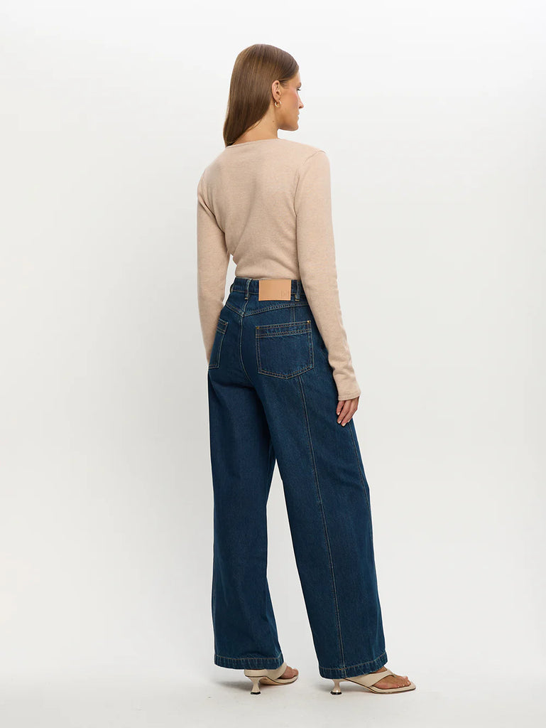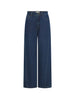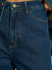 The Carla Denim Jean in a dark indigo wash is a wide leg fit featuring angled side pockets, a logo leather patch complete with signature antique brass hardware.