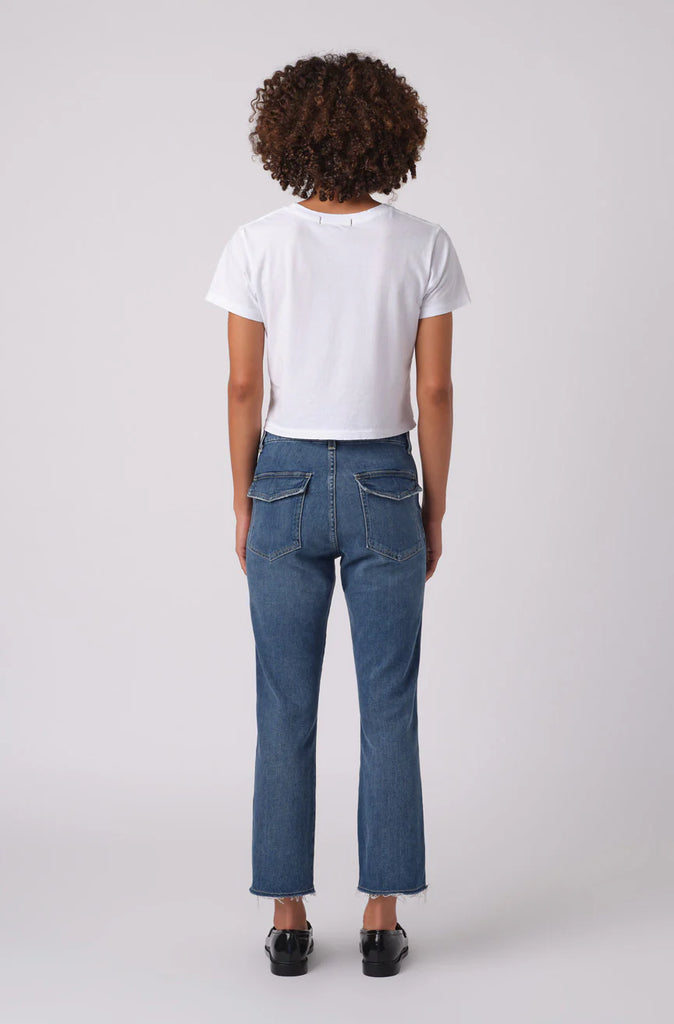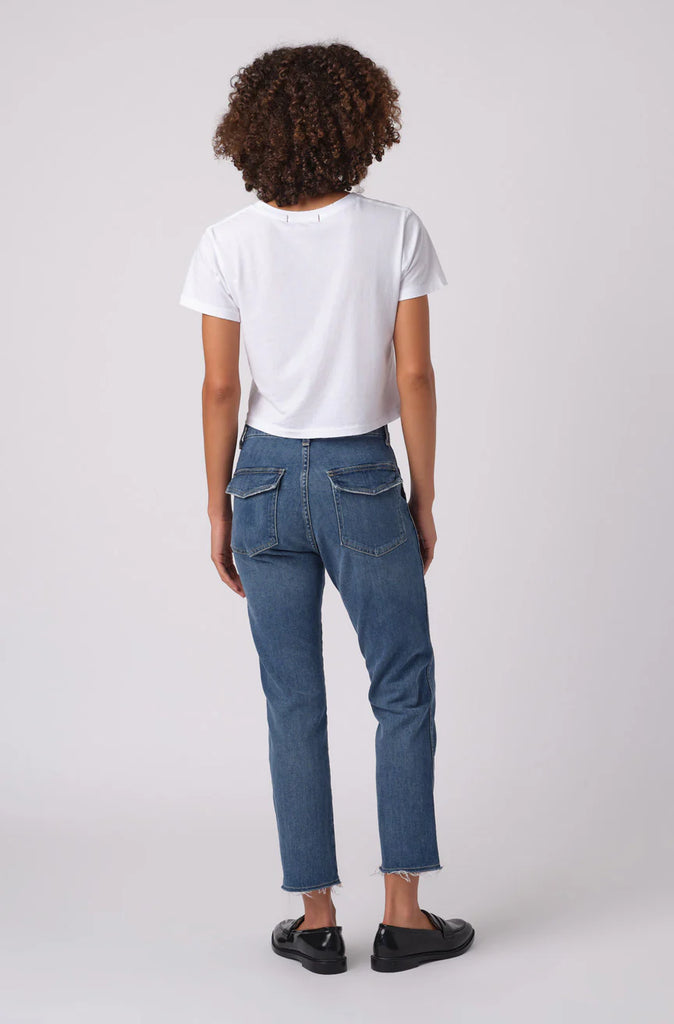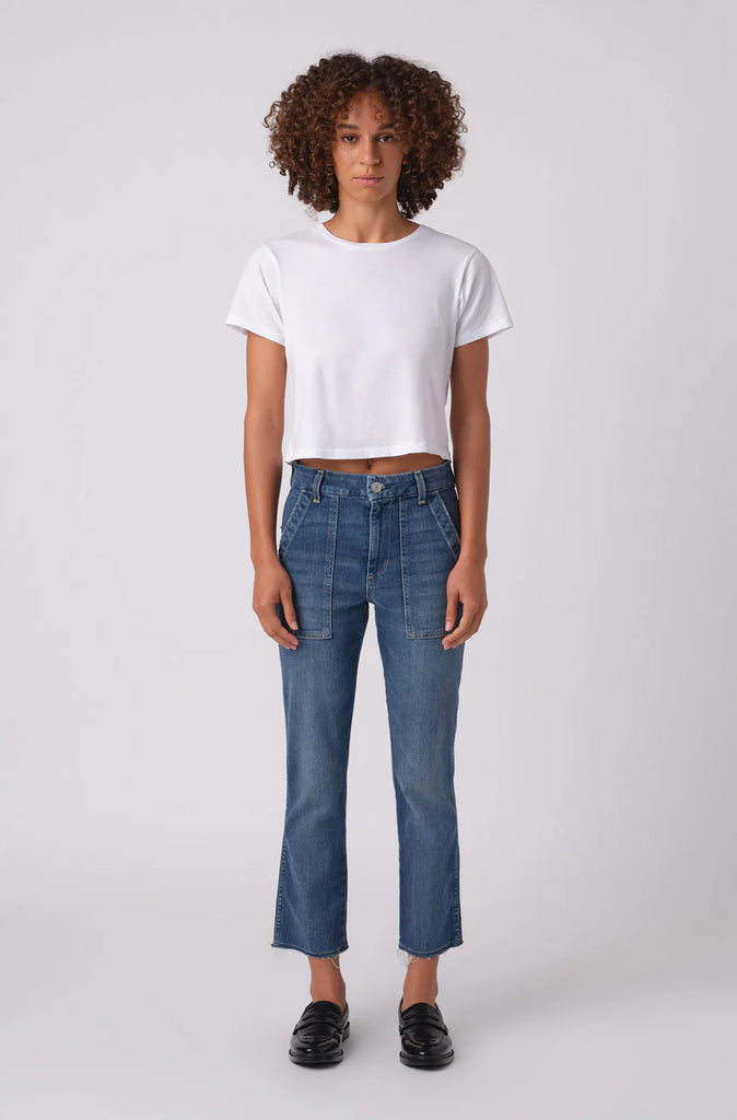 The denim version of the cult classic, Easy Army Trouser, features a relaxed, slightly dropped crotch and crop straight pant with trouser styling. It also includes back and front army patch-style pockets. Easy to wear and effortless to style. Zip fly.