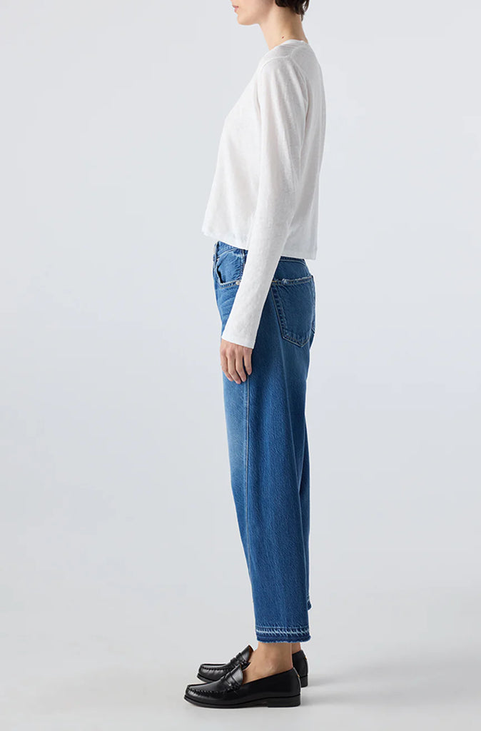 A mid rise, loose fit, horseshoe style jean with a modern twist. Designed to be full in the leg with a curved outseam, cropped ankle, and let down hem, they give off a vintage-inspired vibe.
