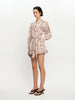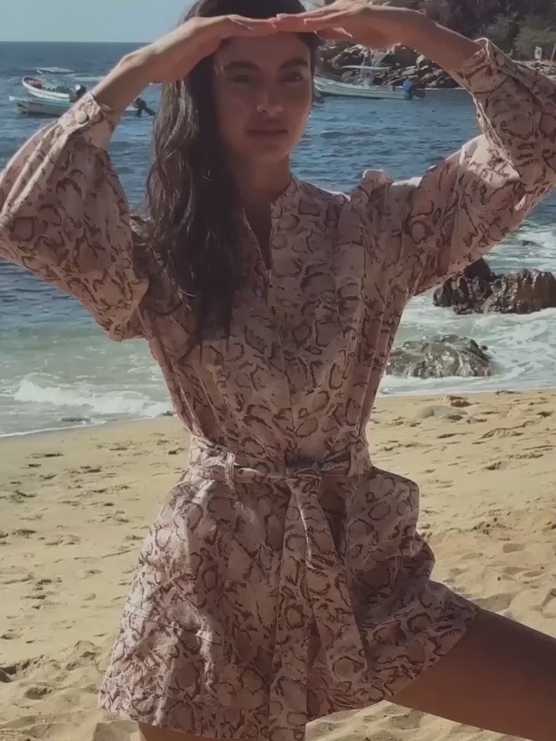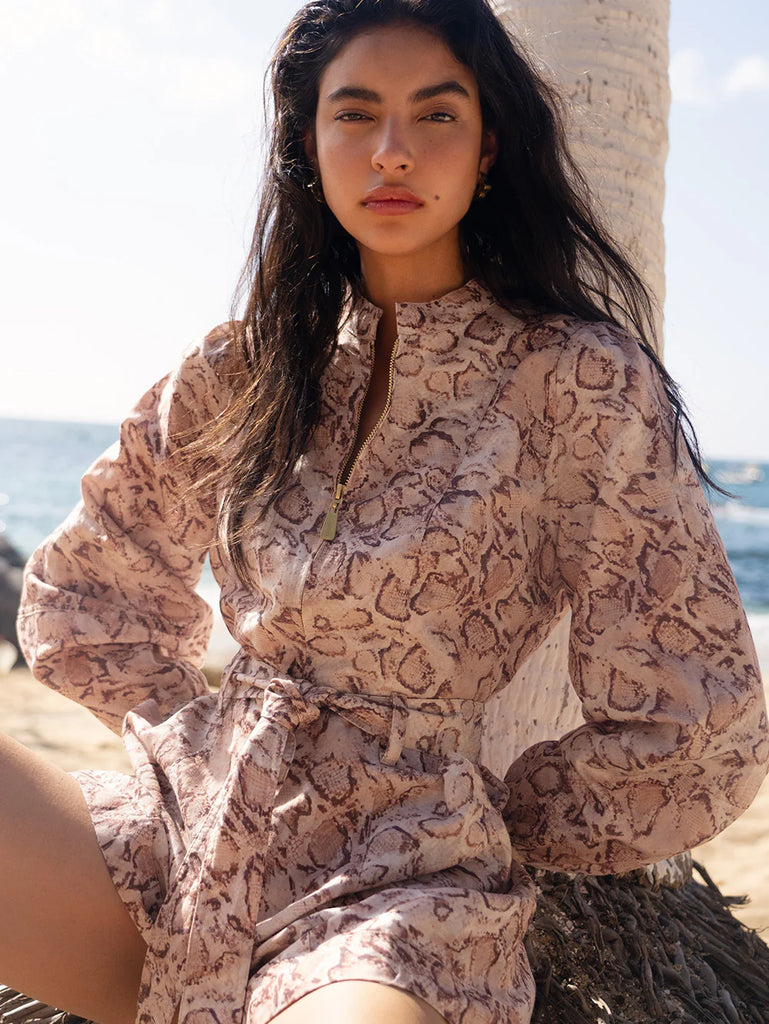 The Simone Playsuit is designed in a soft snake print featuring full length lantern sleeves, zip through front, complete with a removable waist tie.