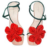 Mid-heel sandal in pink and green moiré. Features a red flower detail, open toe, delicate strappy design with buckle closure, and a padded footbed with a gold-stamped logo. 2.75-inch heel.