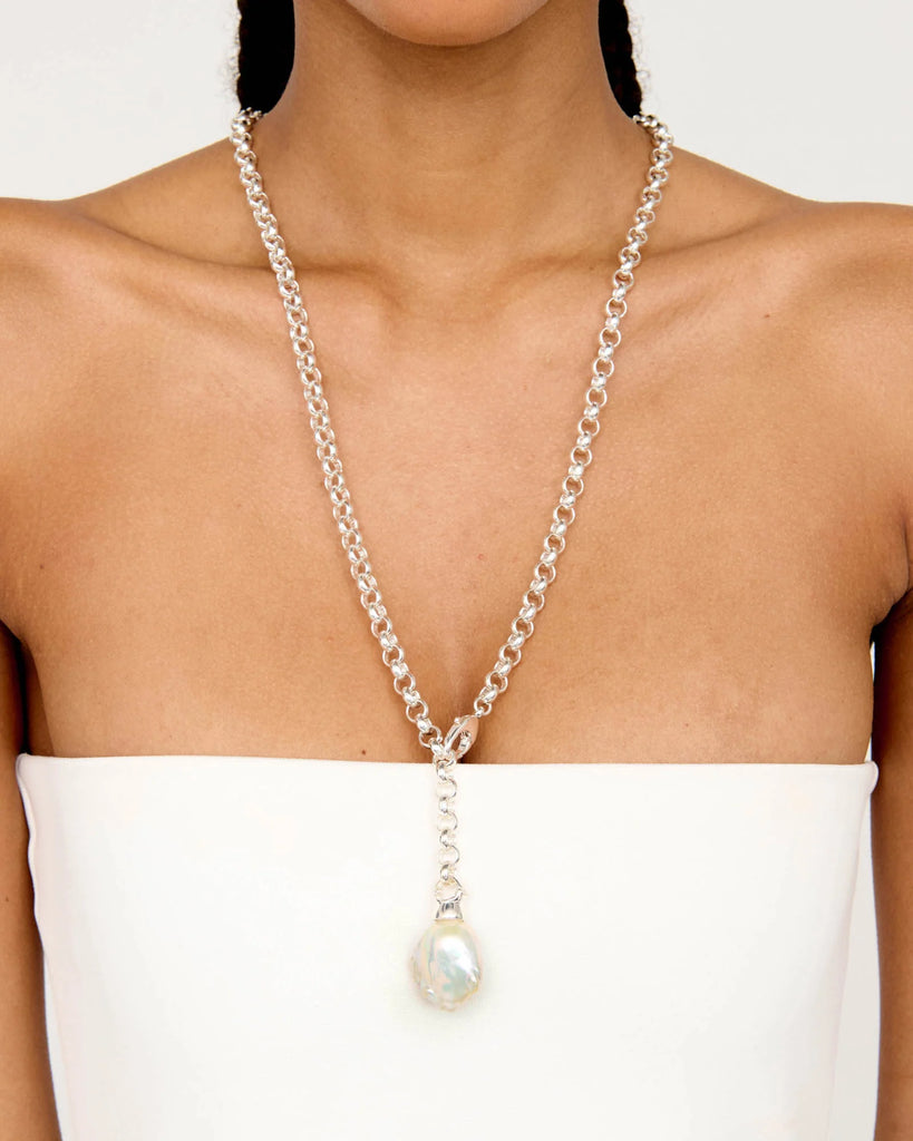Designed to be versatile, our Carmela necklace is a unique piece that can adapt to your changing sense of style. The Carmela can be worn long or short, and features a large baroque pearl, suspended from a linked silver plated chain.