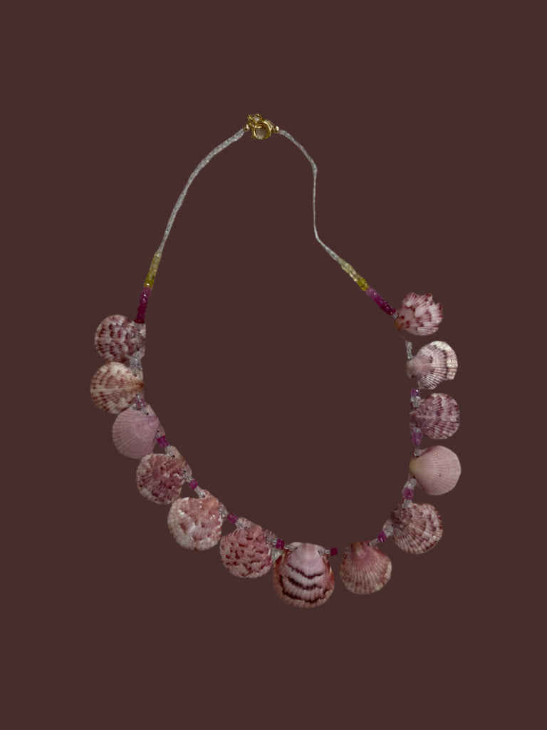 Multi colored pink sapphire necklace featuring small pink scallop shells.