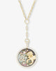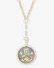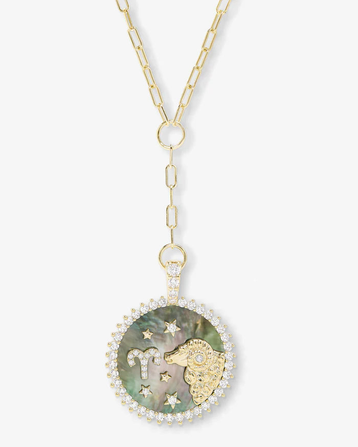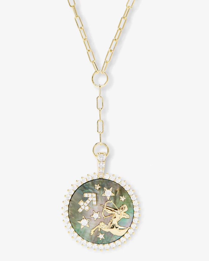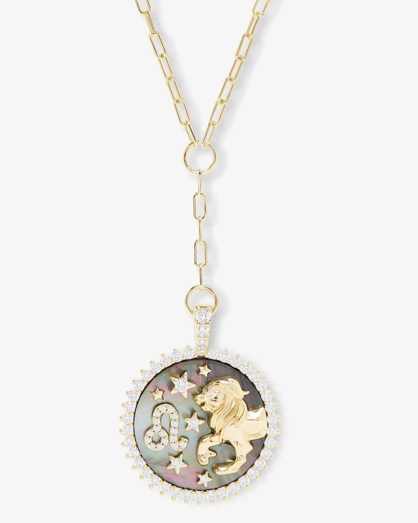 Who says the universe doesn't revolve around you? Our Zodiac Medallion Necklace makes it official. With celestial grey mother-of-pearl, shining simulated diamonds, and a reversible engravable back for whatever cosmic message you're feeling. Astrology never looked so good.