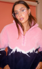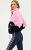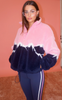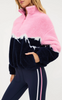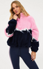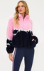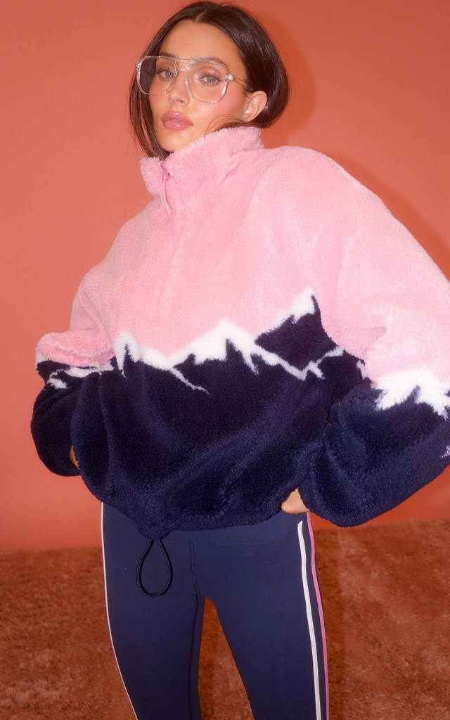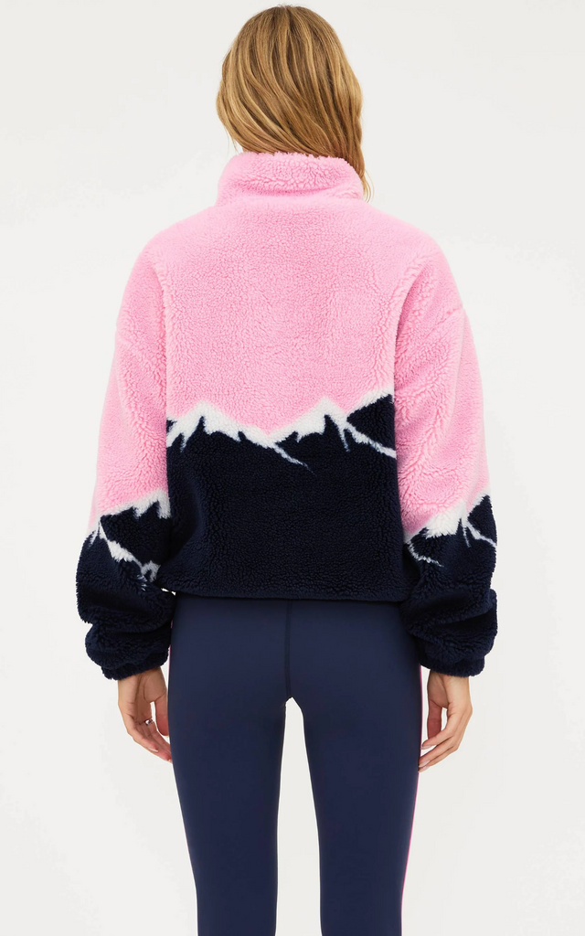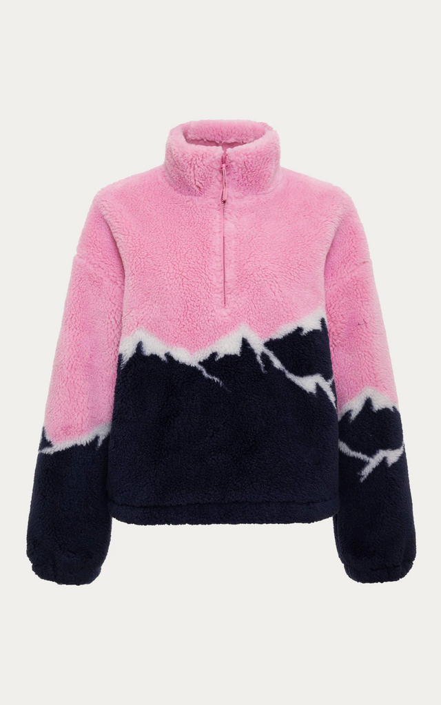 - Bold colorblock mountain peak design in pink, navy, and white