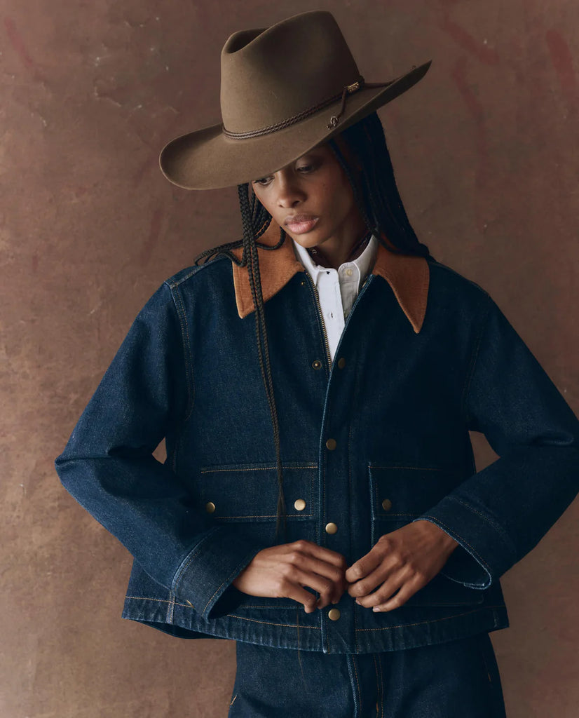 Inspired by heritage-style barn jackets, this reproduction has been reinterpreted with more interesting proportions. It features a cropped length that is longer at the back, creating a charming swing shape. The jacket is made of a structured rinse denim with a corduroy collar that adds authentic detailing. It also includes a snap-front closure with a hidden front zipper, along with traditionally pleated, three-dimensional pockets and snaps at the flap closure.
