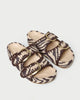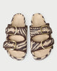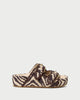 Two-band platform sandal in cream zebra woven straw with black whipstitch detailing. Features large buckle hardware, a padded leather footbed, an open toe, and Velcro fastenings at the straps. 1.75-inch platform.