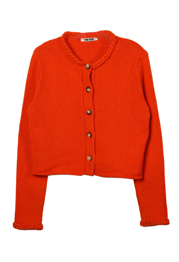 The Doris Cardigan in Persimmon is a wool blend button down cardigan. The chunky braided trim details on the neckline and sleeves make this sweater perfect to throw on when you want to feel cozy but still chic, which is what Ciao Lucia knits are all about.