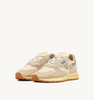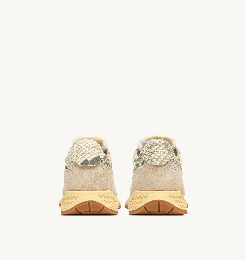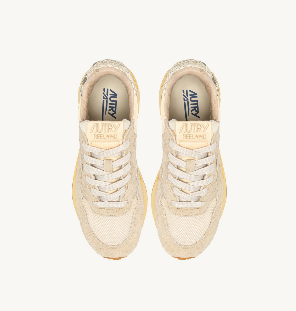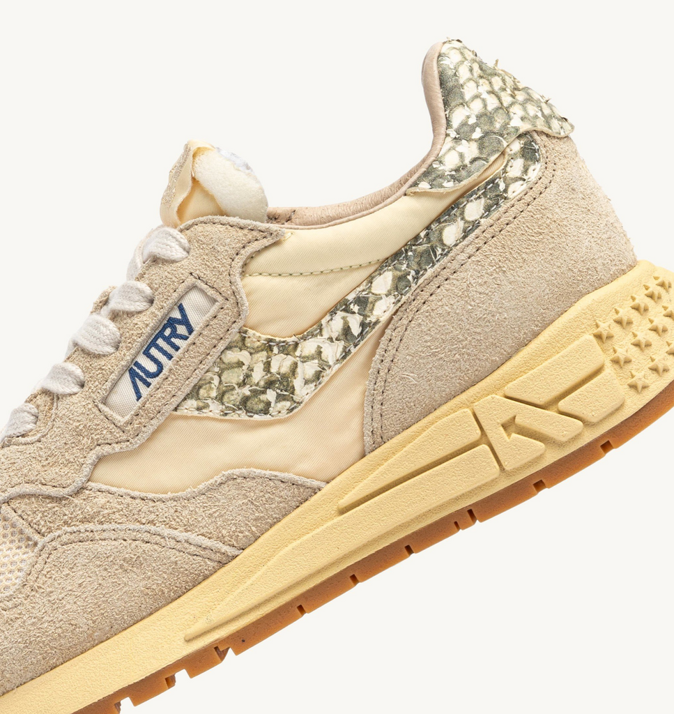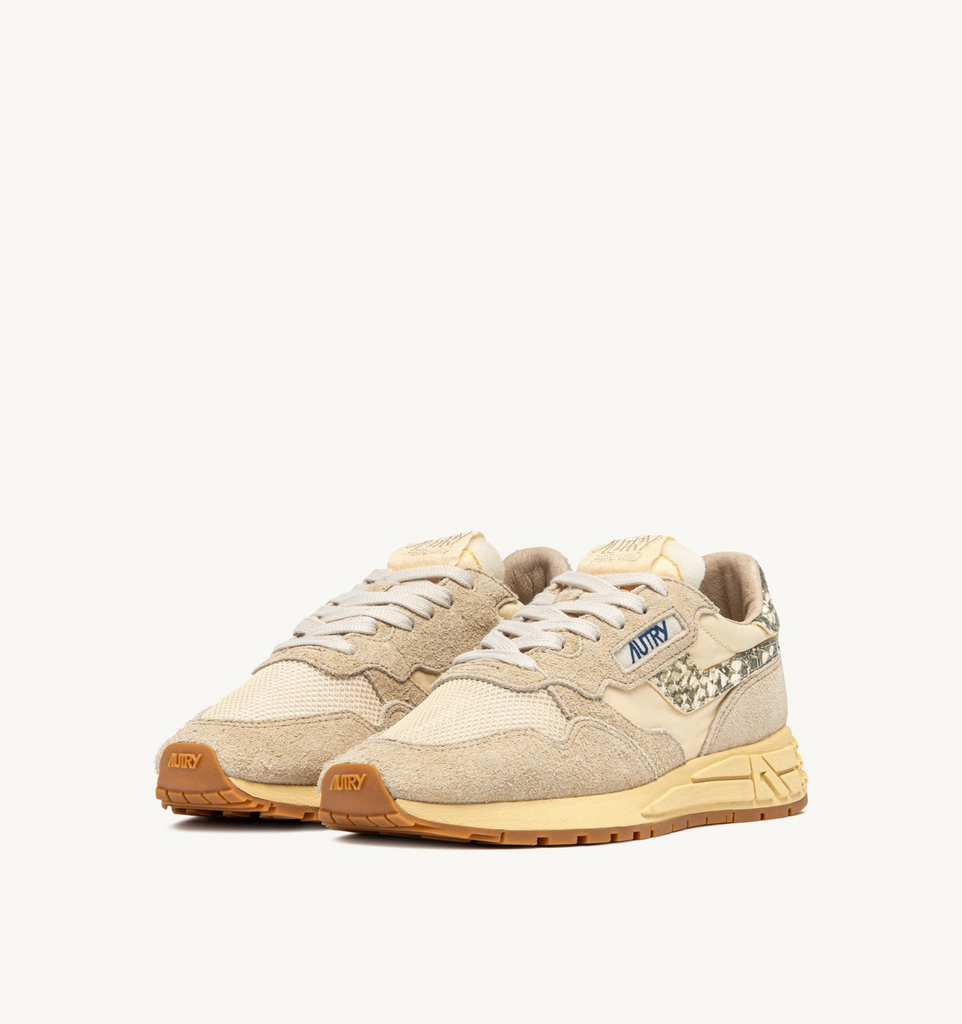 Reelwind sneakers blend Autry’s signature style with elements inspired by the world of running. Featuring a sleek silhouette and an ’80s-inspired retro design, they offer lightness, flexibility, and optimal grip. The women’s style is crafted from a mix of ivory nylon and beige suede with logo details on the heel, outer side, and tongue. A standout feature of this style is the leather applications with snake-diamond print, made from a special Italian goat leather and hand-textured with a python pattern.