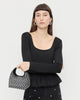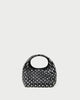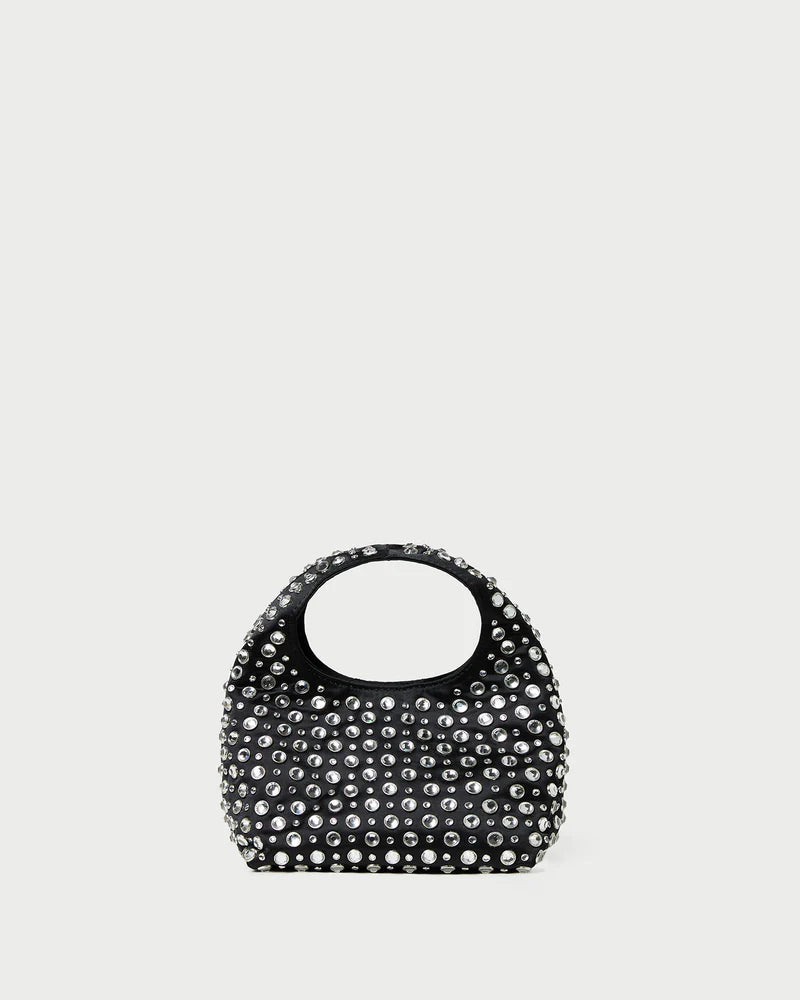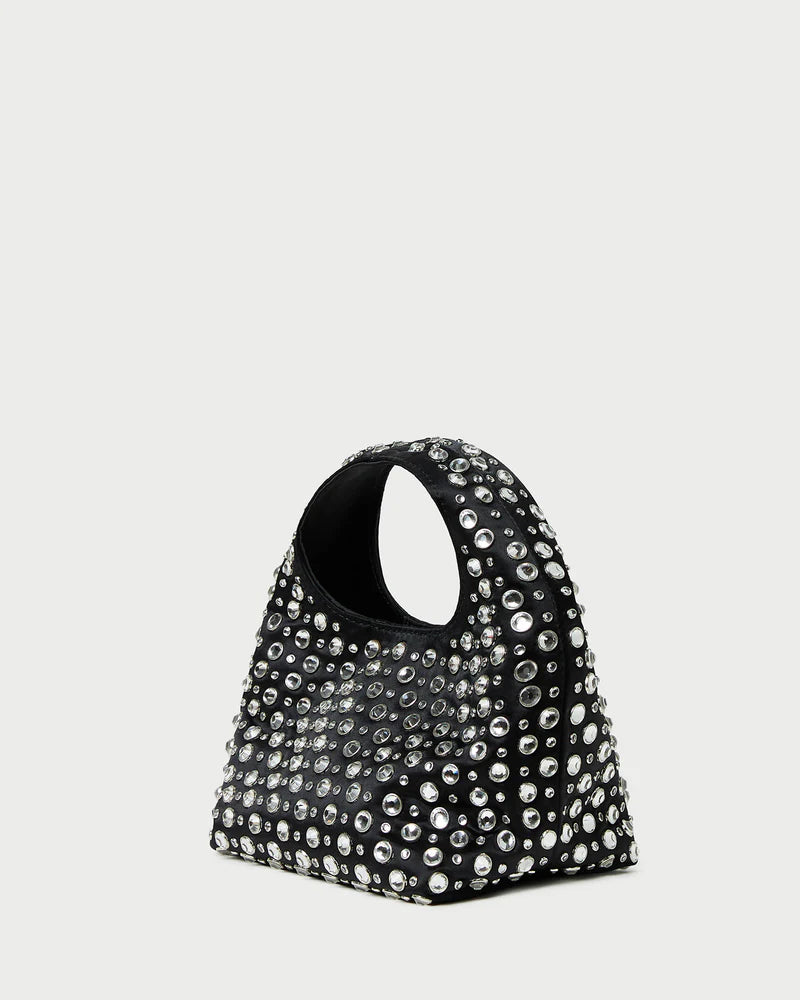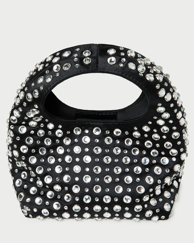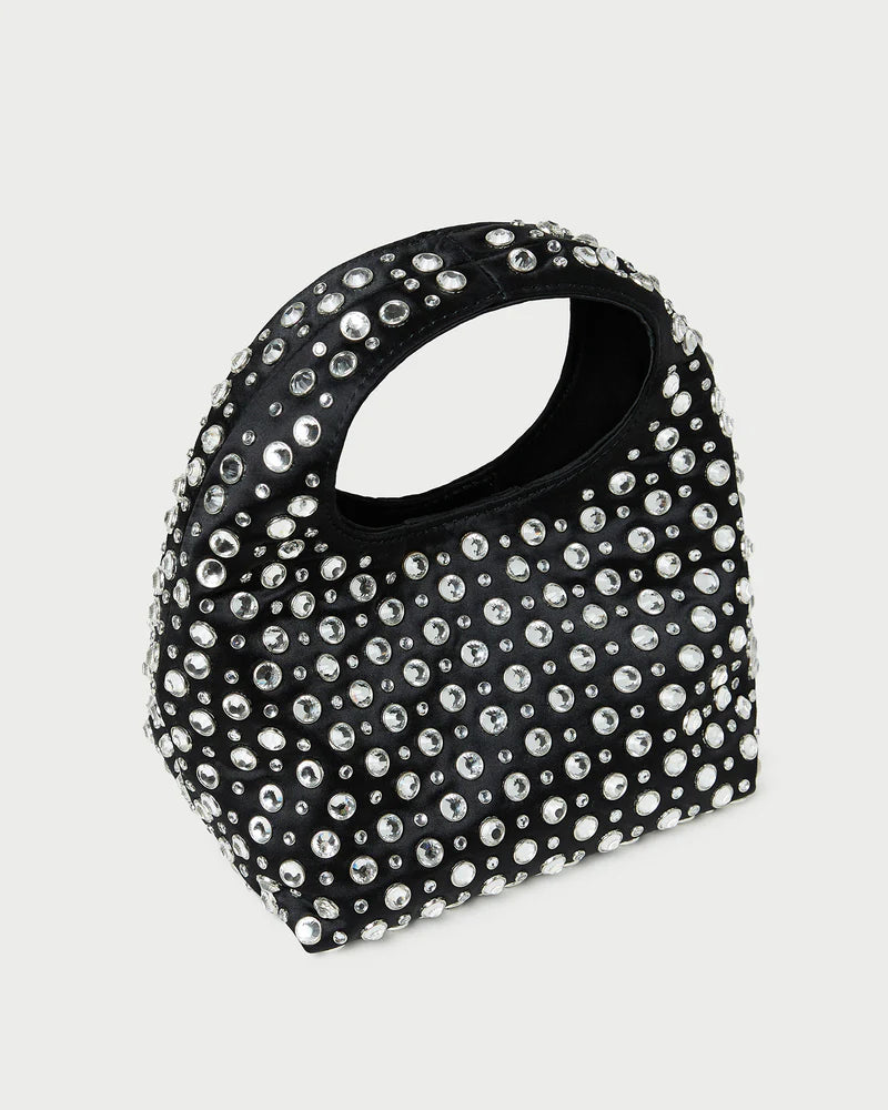 Mini bag in black satin with crystal embellishments. Features a structured top handle, magnetic closure and lined interior.