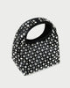 Mini bag in black satin with crystal embellishments. Features a structured top handle, magnetic closure, and lined interior.