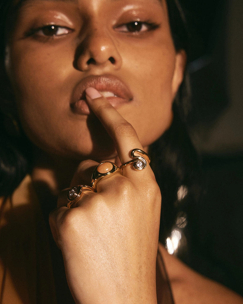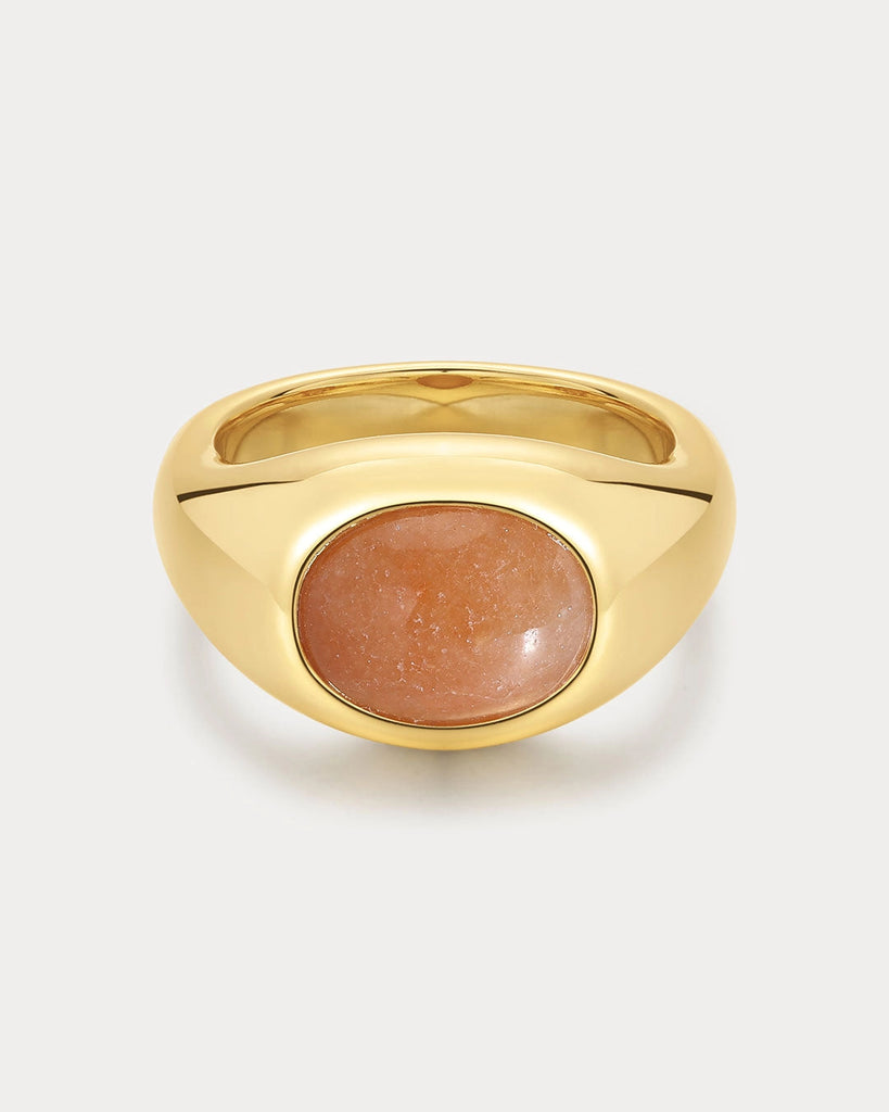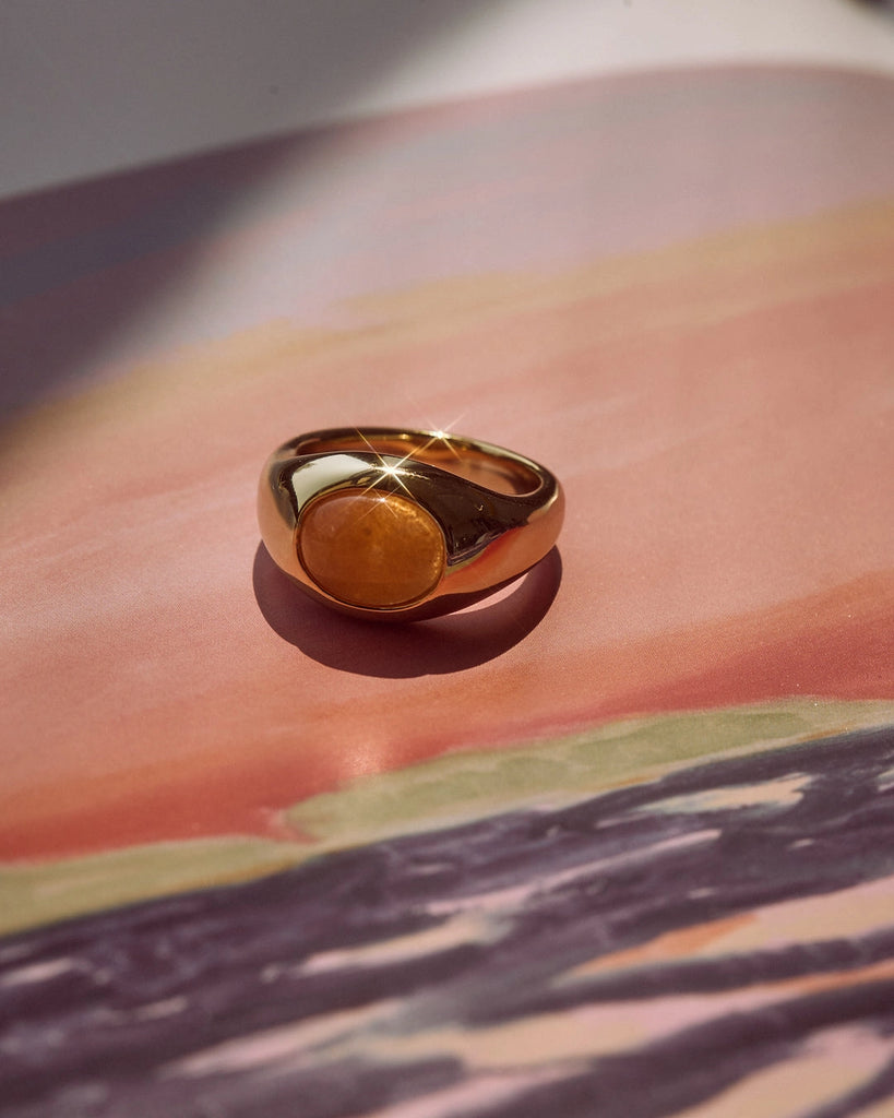 Details * Sunset-Inspired Signet Ring * Ring is 12 x 4 mm * Stone is 8 x 10mm * Ring weighs 8.78 grams * Available in US ring sizes 6, 7, & 8 * Part of the Night Swim Collection * Made from plated brass and Natural Aventurine stone * Plating is waterproof and tarnish free * 14K plated brass with E-Coating * Plated high polish 14K Gold for maximum shine * Ring is 100% nickel-free and cadmium-free