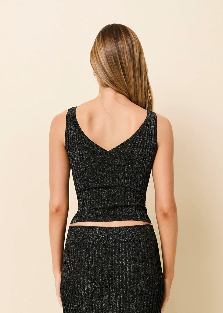 The Tabitha Top is a fitted, full-length silhouette featuring V necklines at both the front and back. Made from lurex fabric and finished with specifcally engineered ribbing for a clean, sculpted look that flatters and fits close to the body. Pair with the Thersa Skirt.