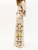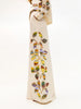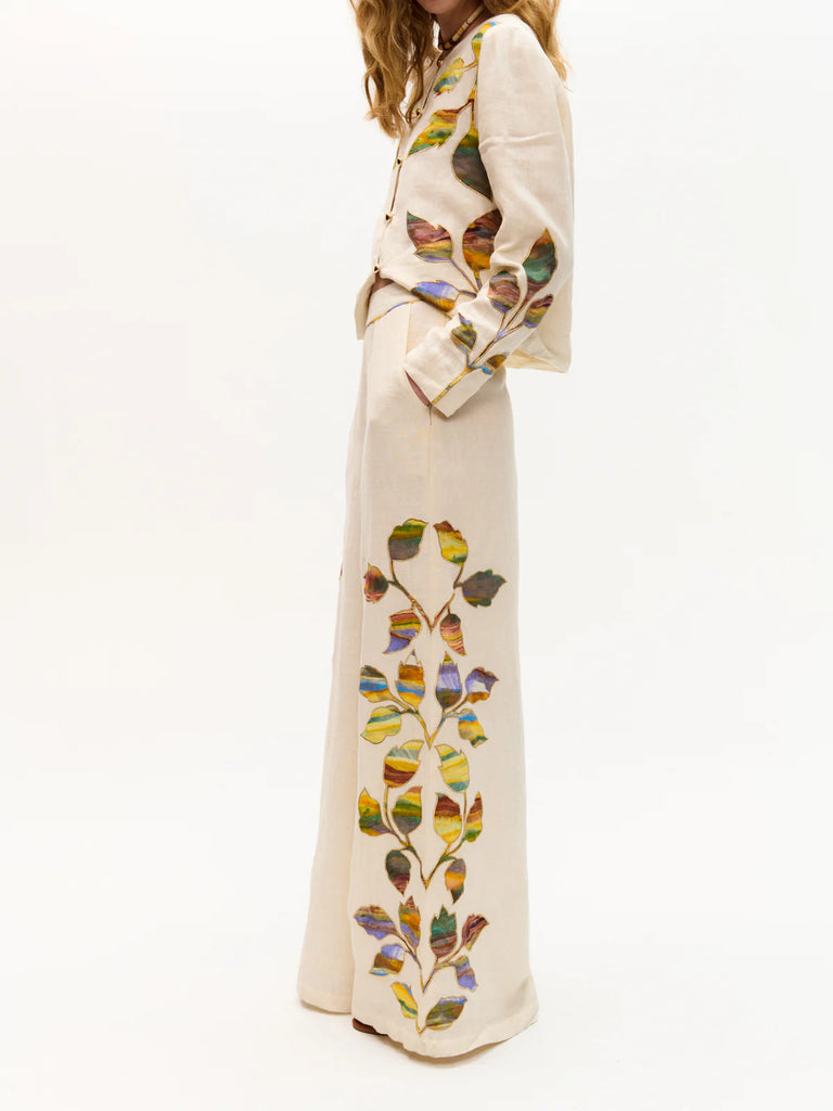 Vertical appliqué leaf detailing in shades of green, orange, blue, and yellow on a cream background
